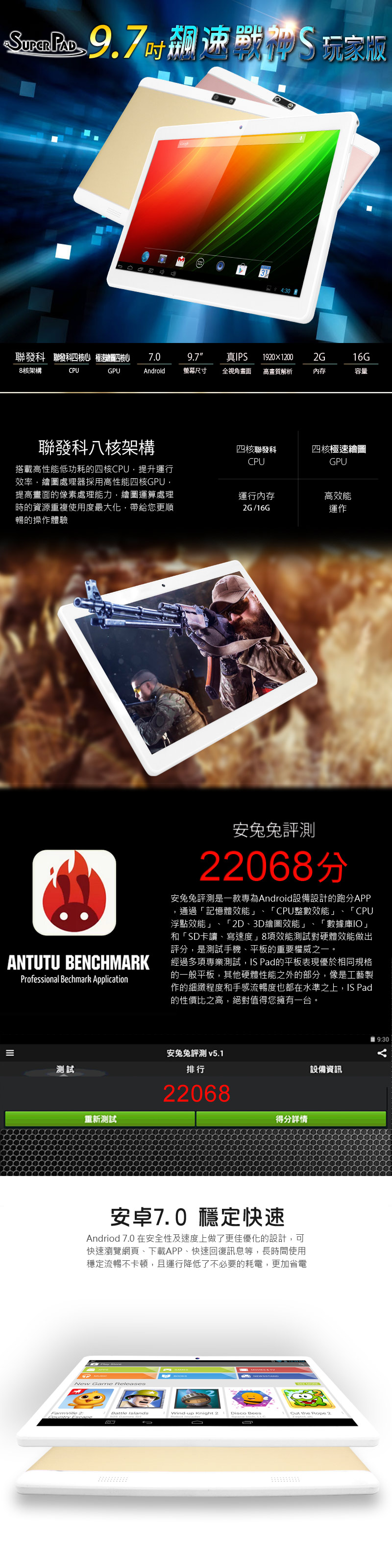 【大力推薦】【SuperPad】一般版 飆速戰神S 9.7吋 聯發科四核心 玩家版 平板電腦(2G/16GB)1台(內含保護貼(已預貼)+變壓器 +USB線)搶先看
